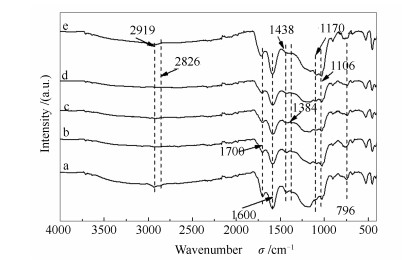 图 3为煤样和未反应残留物红外吸收光谱谱图。由图 3可知,煤样及未反应残留物的红外光谱中谱图主要存在脂肪族基团吸收峰(2 919、2 826、1 438、1 384 cm-1)、芳环吸收峰(1 600和796 cm-1)和含氧官能团(1 700、1 170和1 106 cm-1)吸收峰[18, 19]。随着燃烧反应的进行,脂肪族-CH2、-CH3伸缩振动和变形振动强度呈现下降的趋势,而碳氧键吸收峰和芳烃C=C骨架吸收峰(1 600 cm-1)的强度呈现出先下降后增长趋势,芳烃C-H键(796 cm-1)的变化并不明显。这可能是因为脂肪族基团、羟基和碳氧等含氧官能团在燃烧反应时均有所消耗,当燃烧反应加深到一定程度时,羟基和碳氧等含氧官能团的消耗和新基团的生成交替进行,从而造成其强度不断变化。对褐煤来说,芳烃C-H键反映燃烧反应过程中芳核的稳定情况,在燃烧反应初期,羧酸基的脱羧反应却使芳核的取代程度降低,可以导致芳烃C-H键的增多,部分酚基转化成醌基的反应是唯一可能导致芳烃C-H键减少的因素,因此,其变化规律表明,在燃烧反应过程中,缩核反应和解聚反应可能是交替进行的。