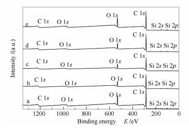 图 4为煤样及未反应残留物的XPS谱图。测试数据以C 1s(284.6 eV)为定标标准进行校正。由图 4可知,位于283、1 225 eV附近的谱峰分别对应C 1s的特征峰和俄歇峰,531和976 eV分别是O 1s的特征峰和俄歇峰,位于100和153 eV附近非常微弱的峰则是Si 2p和Si 2s的特征峰。