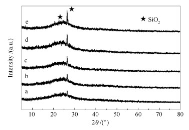 式中,d002为芳香层片间的距离,nm;La为芳香层片直径,nm;Lc为芳香层片的堆垛高度,nm;λ为X射线的波长,其值为0.154 nm;B100和B002分别为100和002峰的半峰宽;θ10 0和θ002是两峰对应的角度。所得相关参数见表 3。由表 3可知,随燃烧反应进行,煤样未反应残留物的芳香度呈增加的趋势,说明燃烧反应有利于胜利脱灰褐煤向芳香化转变。胜利脱灰褐煤未反应残留物的芳香环层片的平均尺寸先增大后减小,说明其芳环簇在燃烧反应初期因为缩聚而变大,燃烧反应后期,氧对芳香结构的攻击使芳香簇受到一定程度的破坏,从而造成芳香层直径呈现下降。在胜利脱灰褐煤燃烧反应过程中,未反应残余物的芳香环层片间的距离变化不大,堆垛高度以及堆垛层数明显增加,说明燃烧反应过程中未反应残留物的晶体结构不断发生变化。