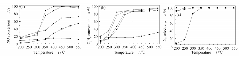 在固定床微型反应器上进行丙烯选择性催化还原NO的活性测试,反应器内径为8 mm,催化剂填装量为0.4 g,反应温度为200-550 ℃,每一个温度点稳定20 min,采用的模拟烟气以He为平衡气,由体积分数分别为0.05%NO、0.3%C3H6、1%O2、0.02%SO2、7%H2O的气体组成,气体总流量为200 mL/min,对应的反应空速为15 000 h-1。NO和NO2通过烟气分析仪(德国RBR,ECOM-J2KN)对其进行在线检测。N2用GC-4000A气相色谱检测,色谱柱为5A分子筛填充柱,检测器为热导池检测器(TCD);C3H6同样用气相色谱检测,色谱柱为毛细柱,检测器为氢火焰检测器(FID)。