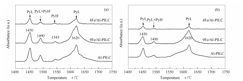 Sample 170 ℃ desorption /(mmol·g-1) 300 ℃ desorption /(mmol·g-1) B L B L Al-PILC 0.005 12 0.051 29 0 0.035 80 4Fe/Al-PILC 0.003 97 0.025 80 0 0.011 40 9Fe/Al-PILC 0.006 91 0.046 95 0 0.034 43 3 结论