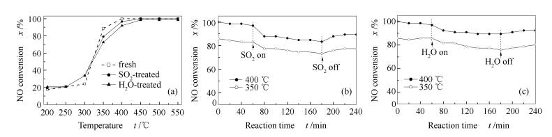 由图 2(a)可知,水热老化和高温硫化后的样品的脱硝性能与原始催化剂相比,NO的转化率差别不大,在400 ℃时仍能取得超过90%的NO转化率。图 2(b)、图 2 (c)为350和400 ℃对9Fe/Al-PILC进行SO2和水蒸气阶跃应答毒化实验的研究结果。在通入0.02% SO2和7% H2O后,在400 ℃时NO的脱除效率分别下降了12.1%和7.58%,350 ℃的NO脱除效率分别下降了8.46%和4.23%。切断SO2后,NO脱除效率回升,说明吸附在催化剂表面的SO2逐步脱附使活性位点再生。切断H2O后,NO脱除效率回升,说明这是物理吸附造成的催化剂失活。结果表明,Fe/Al-PILC受水蒸气的影响较小,而SO2虽然能使其催化性能下降,但SO2去除后其催化活性可一定程度恢复,Fe/Al-PILC具有一定的抗水蒸气和SO2的能力。