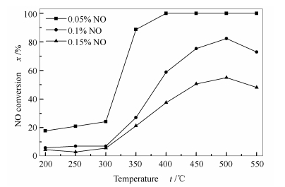 由图 3可知,当NO浓度由0.05%提高到0.1%时,9Fe/Al-PILC催化剂的最高NO脱除效率从100%降低到82.35%,当NO浓度进一步提高到0.15%时,NO最高转化率降低为55%,表明催化剂在NO浓度为0.05%-0.1%波动,NO最高转化率能保持80%以上。