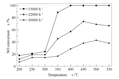 图 4为对9Fe/Al-PILC催化剂在不同空速条件下的脱硝活性测试结果。由图 4可知,当空速从15 000 h-1提高到22 000 h-1时,9Fe/Al-PILC催化剂的最高NO转化率从100%降低到73.81%,当空速进一步增大到30 000 h-1时,NO最高转化率降低为42.86%,表明催化剂在空速15 000-22 000 h-1波动,NO最高转化率能保持70%以上。