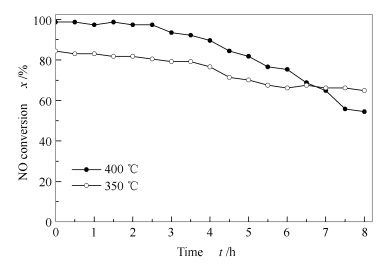 催化剂在长时间较高温度下工作,对其稳定性有较高的要求。图 5为9Fe/Al-PILC在0.05%NO、0.3%C3H6、1%O2,空速为15 000 h-1的条件下催化剂活性实验。由图 5可知,催化剂在8 h内,400 ℃脱硝效率由98.7%降低到54.5%,350 ℃脱硝效率由84.4%降低到64.9%,催化剂表面因积炭而部分失活。当烟气中有H2O时(实际的烟气中都含有H2O),积炭会和H2O反应,从而消除积炭。图 2(c)的结果表明,在有7%的H2O条件下,连续6 h的实验中,NO转化率仅下降了7.58%。
