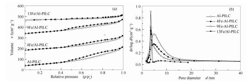 Catalyst Fe w/ (mg·g-1) ABET /(m2·g-1) Pore volume v/(cm3·g-1) Pore diameter d/nm Al-PILC 188 0.328 5.61 4Fe/Al-PILC 40.19 164 0.258 5.52 9Fe/Al-PILC 92.54 186 0.264 4.91 13Fe/Al-PILC 131.19 65 0.097 4.84 图 6(a)为催化剂以及载体的N2吸附-脱附等温线。由图 6(a)可知,所有样品的吸附等温线的形状都基本相似, 属于Ⅳ型吸附等温线,脱附等温线中的滞后环属于H3型。说明这些催化剂具有微孔和介孔结构[26]。在p/p0为0.4-0.45,样品的脱附曲线出现一个明显的拐点,此处吸附曲线和脱附曲线接近完全闭合,是因为被堵塞的孔结构发生复杂的毛细管收缩导致的[27]。负载活性组分后的催化剂保持了Al-PILC层状结构的特征,表明浸渍法负载活性组分不会破坏Al-PILC的孔道结构,Al-PILC良好的热稳定性是催化剂具备稳定催化活性的重要保障。