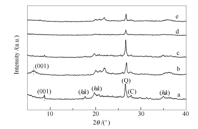 图 7为催化剂的XRD谱图。Dorado等[28]和Chmielarz等[29]报道,各个结构单元层之间的距离即层间距d(001),其特征峰出现在9°附近。结构单元层的无序堆积性由二维(hk)晶面衍射表达,此特征峰出现在18°和35°附近。由图 7可知,在8.9°(d=1.00 nm)出现了蒙脱土的(001)晶面的特征峰,在17.8°出现了蒙脱土的二维(hk)晶面的特征峰,19.8°为hk (02)和(01)耦合峰,35.0°处衍射峰(d=0.26 nm)为hk (13)和(20)耦合峰。26.6°是石英杂质101晶面(Q)衍射峰,27.9°处归属白硅石杂质(C)的衍射峰[30]。蒙脱土经Al交联后,特征衍射峰向小角方向移动到6.7°,d (001)增大到1.31 nm,说明蒙脱土规整的片层结构被撑开,交联柱撑有效,蒙脱土的层状结构没有破坏,在9°、18°和35°附近依旧出现了蒙脱土的(001)晶面和二维(hk)晶面的特征峰。生成的Al2O3一部分作为层间柱矗立于各个单元层间,另一部分以独自的Al2O3形式覆盖在蒙脱土表面,使蒙脱土特征峰的峰强下降。负载铁离子后,在XRD谱图中没有观测到Fe2O3或其他形式的铁化合物晶格特征衍射峰,说明铁物种可能高度分散或以无定形态存在。