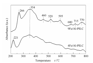 Sample 170 ℃ desorption /(mmol·g-1) 300 ℃ desorption /(mmol·g-1) B L B L Al-PILC 0.005 12 0.051 29 0 0.035 80 4Fe/Al-PILC 0.003 97 0.025 80 0 0.011 40 9Fe/Al-PILC 0.006 91 0.046 95 0 0.034 43 -
