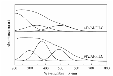 据Brandenberger等[34]报道,波长在200-300 nm的吸收峰归属于单核Fe3+物种,300-400 nm的吸收峰归属于铁氧低聚物种FexOy,大于400 nm的吸收峰归属于催化剂表面的Fe2O3物种。对吸收谱进行分峰处理,可得知4Fe/Al-PILC催化剂中单核Fe3+物种含量较多,而9Fe/Al-PILC催化剂中铁氧低聚物种FexOy较多。随着铁负载量的增加,单核Fe3+物种含量减少,铁氧低聚物种FexOy和催化剂表面的Fe2O3物种增多。结合催化剂活性测试实验来看,单核Fe3+物种和低聚FexOy可能主要影响中低温SCR活性,而表面Fe2O3物种对高温SCR性能影响较大。Fierro等[35]报道,当铁负载量增大时,形成较大的FexOy纳米颗粒会促进还原剂选择性生成CO2,从而导致SCR效率下降。9Fe/Al-PILC表现出最好的催化活性,可能是存在较多的铁氧低聚物种FexOy。