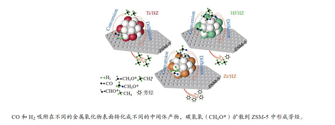 • Titanium subgroup nanometallic oxides (TiO2, ZrO2 and HfO2), prepared via supercritical method, were combined with ZSM-5 and quartz to obtain bifunctional catalysts (Ti/HZ, Zr/HZ, Hf/HZ) and metal oxide catalysts (Ti/Si, Zr/Si, Hf/Si) respectively. The effect of crystal structure, surface oxygen vacancy and syngas adsorption of metal oxides on the catalytic CO hydrogenation was investigated. The results show that the bifunctional catalysts could directly catalyze the syngas to aromatics. The oxygen vacancy concentration, oxygen electron properties and the H/C ratios (the adsorption ratio of CO to H2) of the metal oxides synergistically determine the type of intermediates on the metal oxide surface. The CHxO* species generated on the surface of ZrO2 is beneficial for Zr/HZ catalyst to obtain higher aromatic selectivity (71.15%), while CH3* on TiO2 and HfO2 leads to higher CH4 selectivity for Ti/HZ and Hf/HZ catalysts. The results of this research could provide a valuable reference for design of syngas aromatization catalyst.