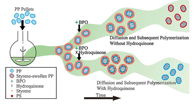 • Inhibitor hydroquinone (HQ) was added to the reaction system to prepare polypropylene/polystyrene (PP/PS) blend pellets without PS on the surface during diffusion and subsequent polymerization of styrene in isotactic polypropylene pellets. The effects of the amount of HQ on diametrical distribution of PS, surface morphology of the pellets and phase morphology inside the blend pellets were investigated.