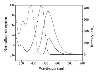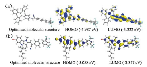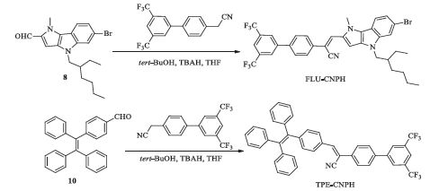 • Two novel π-conjugated cyanostilbene derivatives, FLU-CNPH and TPE-CNPH, were designed and synthesized by introducing the strong electron donor 1, 4-dihydropyrro[3, 2-b]indole and AIE electron donor tetraphenylethylene (TPE) to the (30,50-bis(trifluoromethyl)-biphenyl-4-yl)-acetonitrile, respectively. Both of them were fully characterized and their AIE behaviors were investigated using fluorescence spectroscopy and FE-SEM images. Their optimized structures and frontier molecular orbitals were calculated with the DFT by using Materials Studio 7.0 software to study the relationship between the structure and properties.