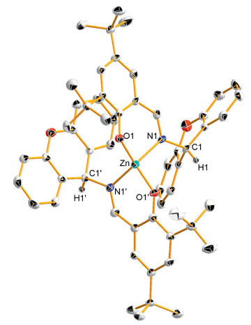 Crystallographic data for 1: C56H60N2O4Zn, M=888.38, crystal dimensions 0.170.180.23 mm3, triclinic, space group, P-1, a=10.9901(7), b=16.2430(19), c=17.7061(19)Å, V=2669.6(6)Å3, Z=2, calcd=1.2137 g cm-3, MoKa radiation (=0.71073Å), T=291 K. Scans, wR2=0.2141, R=0.0750, S=1.077, for 619 parameters. CCDC 1469815 contains the supplementary crystallographic data for this paper. These data can be obtained free of charge from The Cambridge Crystallographic Data Centre via www.ccdc.cam.ac.uk/data_request/cif.