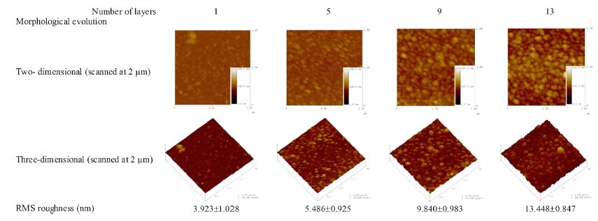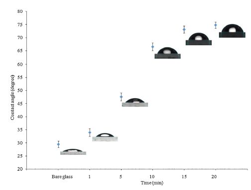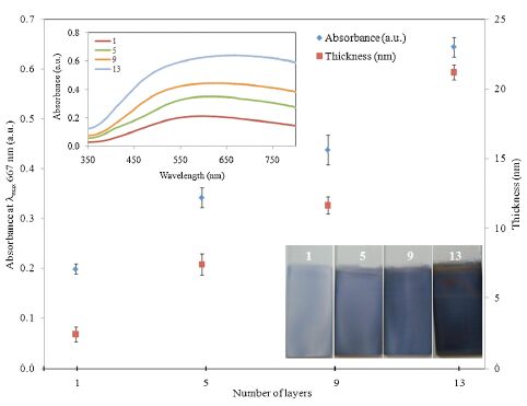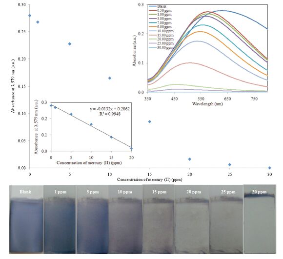 A simple layer-by-layer deposition technique was used to fabricate the multilayer thin films of unmodified silver triangular nanoplates (AgTNPs). The multilayer of AgTNPs thin films were fabricated by alternate deposition of each anionic sodium citrate stabilized AgTNPs and cationic poly(diallyldimethylammonium chloride). All prepared AgTNPs multilayer thin films were exhibited a strong plasmon band at the wavelength of 667 nm, which confirmed the formation of AgTNPs onto the substrate. The characteristics of the multilayer thin films were investigated using contact angle measurement, UV-visible spectroscopy, X-ray diffraction analysis (XRD), atomic force microscope (AFM) and field emission scanning electron microscope (FESEM). As these films are to be used as a mercury (II) colorimetric sensor, the changes in optical properties of the films were evaluated for various mercury (II) concentrations. AgTNPs assembled into thin films showed a strong color shift from blue to mauve and colorless when exposed to mercury (II). The constructed multilayer thin films exhibited excellent color changes of mercury (II) with a linear range between 0.5 and 20 ppm. The limit of detection (LOD) and limit of quantitation (LOQ) were 0.45 0.002 and 1.52 0.002 ppm, respectively. The recovery values of AgTNPs multilayer thin films are satisfactory in the range of 100.1%-106.4% when applied to determining mercury (II) in water samples.
