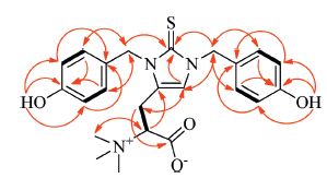 • Gastrolatathioneine (1), an unusual natural product derived from ergothioneine, a fungal amino acid containing an imidazole-2-thione moiety, was isolated from an aqueous extract of "tian ma" (the Gastrodia elata rhizomes). The structure of 1 including the absolute configuration was determined by extensive spectroscopic data analysis, combined with comparison of an experimental circular dichroism spectrum and calculated electronic circular dichroism spectra of stereoisomers, and confirmed by X-ray crystallography. The natural origin of 1 was proved by HPLC-ESIMS analysis of the crude extract. A biogenetic pathway of 1 is proposed on the basis of metabolic post-modification of ergothioneine that is biosynthesized by a symbiotic fungus. The plant and symbiotic fungus are co-producers of 1.