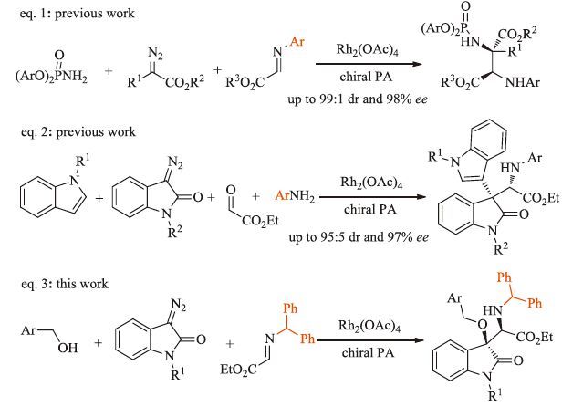 (a) H. Qiu, M. Li, L.Q. Jiang, et al., Highly enantioselective trapping of zwitterionic intermediates by imines, Nat. Chem. 4(2012) 733-738;(b) D. Zhang, H. Qiu, L. Jiang, et al., Enantioselective palladium(II) phosphate catalyzed three-component reactions of pyrrole, diazoesters, and imines, Angew. Chem. Int. Ed. 52(2013) 13356-13360;(c) S. Jia, D. Xing, D. Zhang, W. Hu, Catalytic asymmetric functionalization of aromatic C-H bonds by electrophilic trapping of metal-carbene-induced zwitterionic intermediates, Angew. Chem. Int. Ed. 53(2014) 13098-13101;(d) D. Zhang, J. Zhou, Z. Kang, W. Hu, Bond cleavage, fragment modification and reassembly in enantioselective three-component reactions, Nat. Commun. 6(2015) 5801-5809;(e) M. Li, X. Guo, W. Jin, et al., An enantioselective three-component reaction of diazoacetates with indoles and enals by iridium/iminium co-catalysis, Chem. Commun. 52(2016) 2736-2739;(f) H. Qiu, D. Zhang, S.Y. Liu, et al., Asymmetric C-H functionalization of indoles via enantioselective protonation, Acta Chim. Sin. 70(2012) 2484-2488.