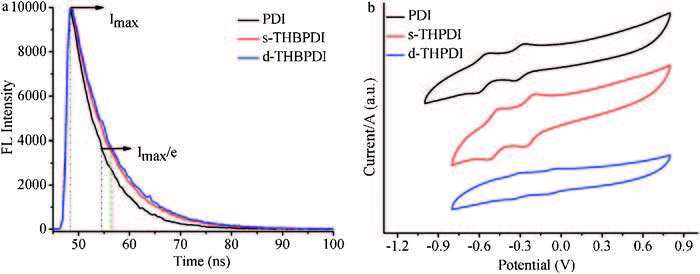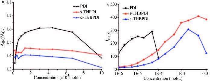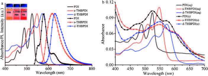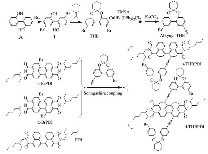 The perylene diimide derivatives (s-THBPDI and d-THBPDI) bearing oxygen bridged twisty heptatomic biphenyl in the bay positions of the perylene core through acetylene bond were designed and synthesized. The photophysical properties of the functionalized dyes were investigated in solution and solid state by UV-vis and photoluminescence (PL) spectra. Their UV-vis and PL spectrum both exhibited the different concentration-dependent behaviors due to the difference of chemical structure. Moreover, cyclic voltammetry results indicated that the introduction of oxygen bridged twisted heptatomic biphenyl could decrease the LUMO energy level of the perylene diimide effectively and made it promising material in photoelectric devices.