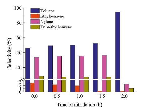 • Nitrided hierarchical porous ZSM-5 was synthesized by nitridation of hierarchical porous ZSM-5 with flowing ammonia at elevated temperature. The samples were characterized by XRD, SEM, Nitrogen sorption isotherms, NH3-TPD and Py-IR, and evaluated in alkylation of benzene and methanol. The result indicated that the high specific surface area of parent ZSM-5 was maintained, while the Brönsted acidity was effectively adjusted by nitridation. Moreover, the high suppression of ethylbenzene was observed on nitrided catalyst and this could be attributed to the decrease of Brönsted acidity which suppressed the methanol to olefins reactions.