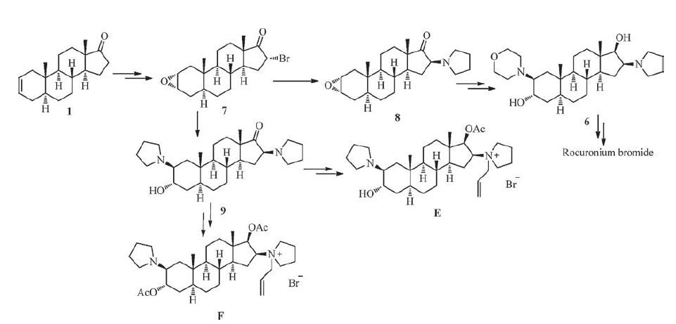 Rocuronium bromide has been used as an aminosteroid non-depolarizing neuromuscular blocker and muscle relaxant. In this work, a new and efficient route for preparing a key intermediate 2β-(4-morpholinyl)-16β-(1-pyrrolidinyl)-5α-androstan-3α,17β-diol (6) was developed through a ring-opening of epoxide followed by introducing and pyrrolidine. Compound 6 can easily provide rocuronium bromide and the overall yield of compound 6 in 5 steps increased to 57.8%, which was higher than currently reported methods. Extraordinarily, this method would avoid the generation of disubstituted impurities E and F which are difficult to remove.