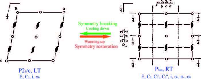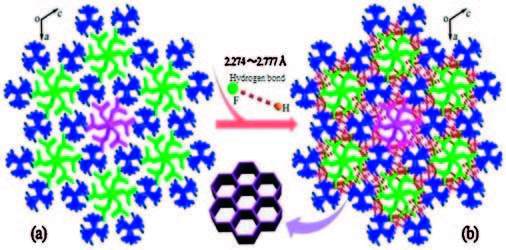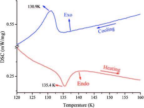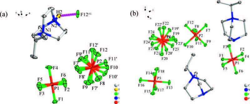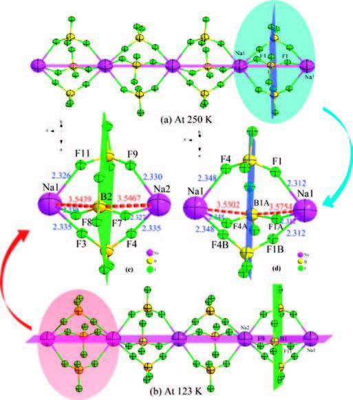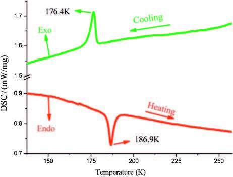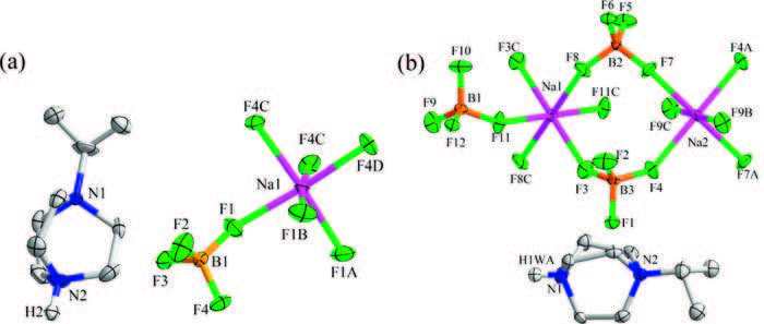 Two novel phase transition materials,[C9H20N2] [Na(BF4)3] (1) and[C9H20N2] [(PF6)2] (2), were synthesized based on 1-isopropyl-1,4-diazabicyclo[2.2.2]octan-1-ium with sodium tetrafluoroborate and hexafluorophosphoric acid, respectively. Differential scanning calorimetry measurements detected that 1 and 2 underwent reversible phase transitions, which were confirmed by dielectric measurements. Single crystal X-ray diffraction data suggested that compound 1 changed from a high temperature phase with a space group of P63 to a low temperature one with a space group of P21/c, and that compound 2 transformed from the space group of Pbca at room temperature to P21/c at low temperature. Formation of hydrogen bonds and distortion of 1,4-diazabicyclo[2.2.2]octane rings may drive the transitions.