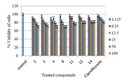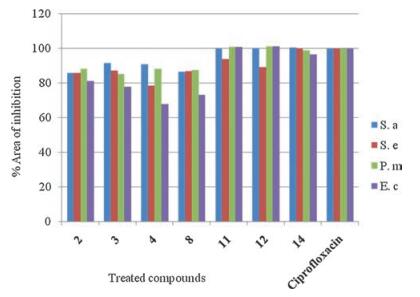 • A new series of 1, 2, 4-triazine derivatives possessing indole nucleus were synthesized with an aim to explore their effect on in vitro growth of microorganisms causing microbial infection. In vitro antimicrobial activity was performed against S. aureus, S. epidermidis, P. mirabilis and E. coli using disk diffusion method. The MIC was detected using the double dilution method. The results were compared by calculating percent inhibition area/μg of the compounds with the standard drug "Ciprofloxacin". Selected compounds were evaluated for toxic effects using human hepatocellular carcinoma (HepG2) cell line by MTT-assay. Results revealed that some compounds of the series were found to exhibit better activity with less toxicity than Ciprofloxacin.