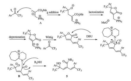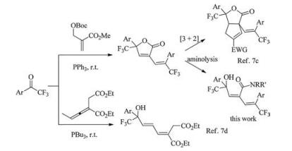 A one-pot reaction sequence of sequential phosphine-promoted tandem annulations of aryl trifluoromethyl ketones and MBH (Morita-Baylis-Hillman) carbonates and DBU-mediated aminolysis was developed. This method provides a step-economical approach to trifluoromethylated dienamides with diverse structural complexity from readily available starting materials in moderate yields.
