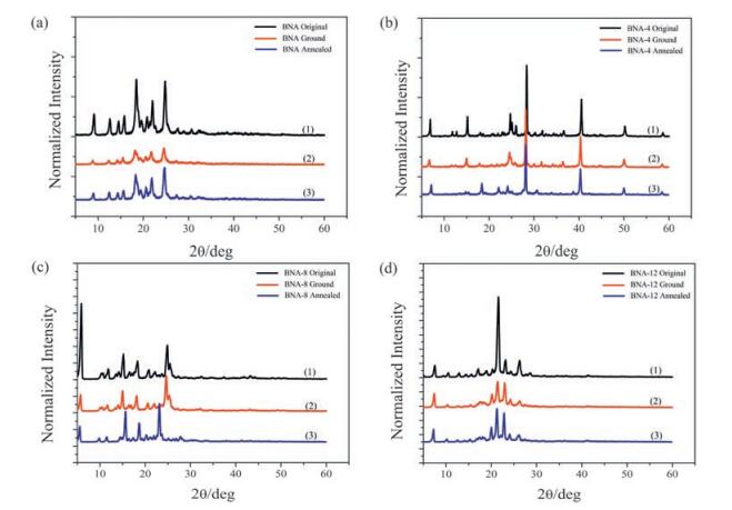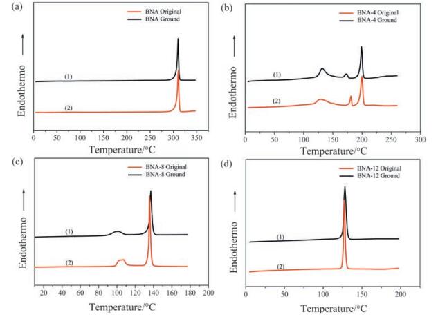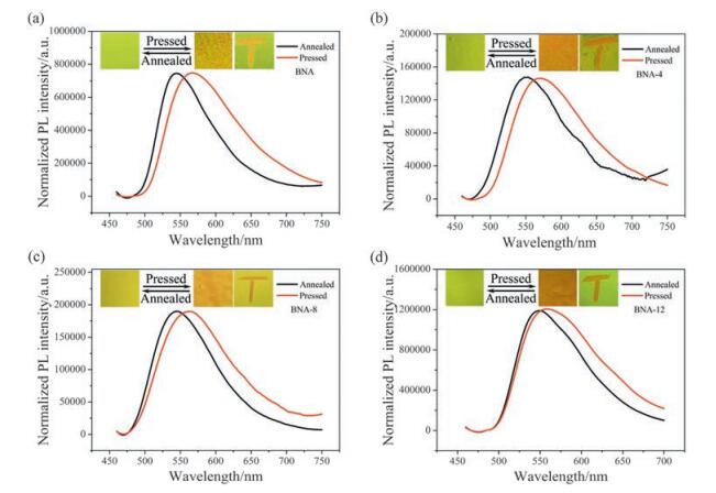 Four derivatives of 9, 10-bis[2-(2-alkoxynaphthalen-1-yl)vinyl]anthracene (BNAs) were designed, successfully synthesized and characterized by spectrofluorometer, powder wide-angle X-ray diffraction (PXRD) and differential scanning calorimetry experiments (DSC), etc. It was found that these compounds exhibited aggregation-induced emission phenomenon. Moreover, these target compounds displayed reversible color change from yellow to orange upon pressing and annealing process. Interestingly, all of BNAs obviously presented red-shifted piezofluorochromic (PFC) properties and behaved mainly length dependence of alkoxy group, in which, BNA displayed the largest PFC spectral shift (△lPFC=26 nm). The PXRD profiles demonstrated the transformation from crystalline to amorphous state upon grinding, and the mechanism of PFC behaviors was proposed. Thus, changing the length of alkoxyl chain could be an alternative way to tune their PFC behaviors.