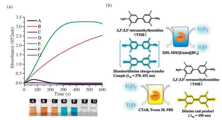 The traditional surfactant sodium dodecyl sulfate (SDS) and ionic liquid 1-ethyl-3-methylimidazolium tetrafluoroborate ([Emim][BF4]) have been combined to create a novel efficient medium for chromogenic catalysis of 3, 3', 5, 5'-tetramethylbenzidine with horseradish peroxidase in presence of H2O2. The results have shown the [Emim][BF4] in the mediums can promote the rate of formation of the blue chromogen, the SDS is responsible for the stabilization of the blue chromogen due to the electrostatic attraction between positively charged blue chromogen and the negatively charged surfactant. The SDS/[Emim][BF4] combination not only enhance catalytic activity of HRP remarkably but also stabilize the blue chromogen formed in the HRP oxidation of the substrate TMB compared to the conventional medium. Based on the superior combination of SDS and [Emim][BF4], the colorimetric assay for detecting HRP activity and H2O2 concentration was established. This work demonstrates a novel efficient medium for chromogenic catalysis with potential applications in biosensors and clinical diagnosis.
