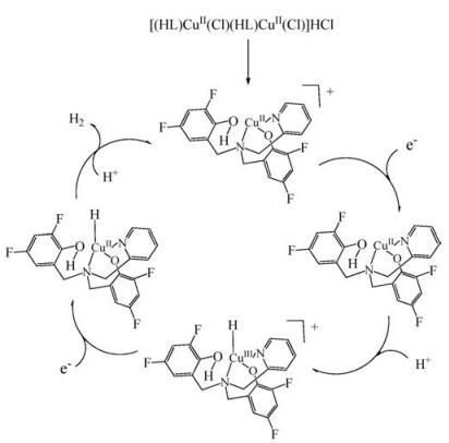 A new material for both magnetic coupling and electrocatalytic hydrogen generation based on a copper complex, [(HL)CuCl-CuCl(HL)]HCl 1 is prepared by the reaction of 2-(pyridylmethyl)amino-N, N-bis(2-methylene-4, 6-difluorophenol) (H2L) and CuCl2·2H2O. In solid, complex 1 is built from two copper units ([(HL)CuCl]), and exhibits an antiferromagnetic exchange interaction between copper (Ⅱ) ions (J=-160 cm-1). In liquid, 1 can electrocatalyze hydrogen generation both from acetic acid with a turnover frequency (TOF) of 16.3 moles of hydrogen per mole of catalyst per hour at an overpotential (OP) of 941.6 mV (in DMF), and a neutral buffer with a TOF of 1415.6 moles of hydrogen per mole of catalyst per hour at an OP of 787.6 mV.