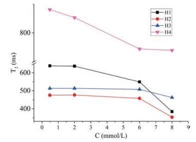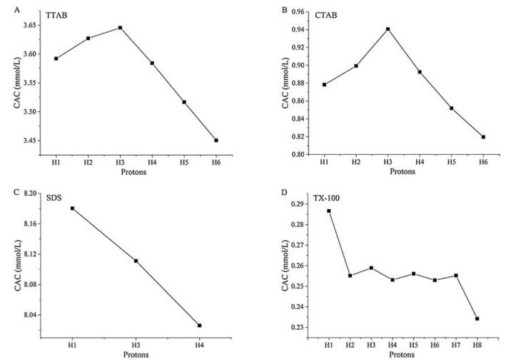 The critical aggregation concentration (CAC) of four with three kinds of conventional surfactants, namely, two cationic surfactants [hexadecyltrimethyl ammonium bromide (CTAB) and tetradecyltrimethyl ammonium bromide (TTAB)], one anionic surfactant [sodium dodecyl sulfate (SDS)], and a nonionic surfactant [Triton X-100 (TX-100)], were determined by variation of 1H chemical shifts with surfactant concentrations. Results show that the CAC values of protons at different positions of the same molecule are different, and those of the terminal methyl protons are the lowest, respectively, which suggests that the terminal groups of the alkyl chains aggregates first during micellization. Measurement of the transverse relaxation time (T2) of different protons in SDS also show that the terminal methyl protons start to decrease with the increase in concentration first, which supports the above mentioned tendency.