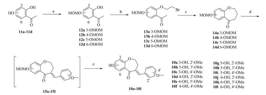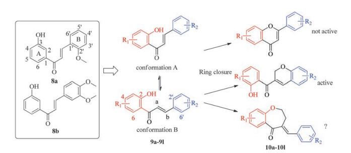 A series of benzoxepin-5-ones were designed and synthesized by the cyclization of chalcones which were previously found as FXR antagonists. The cellular FXR antagonism of benzoxepines was investigated, among which the most potent compound 10l was able to reduce the plasma and hepatic triglyceride and plasma ALT levels in mice.
