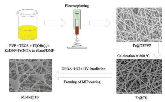 In this study, Fe-doped TiO2/SiO2 (Fe@TS) nanofibrous membranes with molecular imprinted modification, were fabricated by a combination of sol-gel process, electrospinning, calcination and liquid phase deposition techniques. The precursor sol was prepared from one-pot condensation of poly (vinylpyrrolidone), ferric chloride hexahydrate, tetraethyl orthosilicate and titanium n-butoxide in the mixture solvents of N, N-dimethylformamide and ethyl alcohol. Fibrous membrane wasthen fabricated by electrospinning, followed by calcination to form the Fe@TS composite. The physicochemical properties of Fe@TS were characterized. Thereafter, 4-nitrophenol (4NP) was used as the template to deposit onto nanofibrous Fe@TS membranes, with a thin layer of molecular imprinted polymer in liquid phase. The photodegradation capabilities of 4NP and methyl orange wereexamined in both single and binary systems. The results demonstrated that molecular imprinted Fe@TS membranes exhibited excellent selectivity for photodegradation of 4NP.