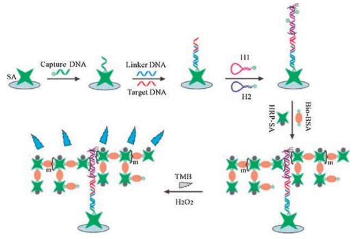A dual-amplification system for colorimetric DNA detection based on the assembly of biomolecules