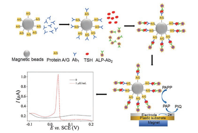 In this paper, we reported a sensitive electrochemical immunosensor coupling protein A/G@magnetic beads and an ALP-based enzymatic-electrochemical reaction on inkjet printed microchips for the determination of TSH. The use of protein A/G magnetic beads resulted in an increased sensitivity in TSH detection by enabling the immobilization of large amount of antibodies on the solid phase of the electrochemical transducer. Another signal amplification approach in this assay was the alkaline phosphatase and p-aminophenyl phosphate enzymatic-electrochemical reaction, which combined enzymatic reaction and electrochemical reaction. The immunosensor showed a detection limit of 0.005 μIU/mL. On the other hand, the present method is simple, specific and does not require sophisticated instrumentations. Moreover, the immunosensor showed potential applications in clinical analysis. It represents a compelling alternative to establish biological molecular detection techniques and opens a versatile way for discerning other hotspot mutations in clinical specimens.