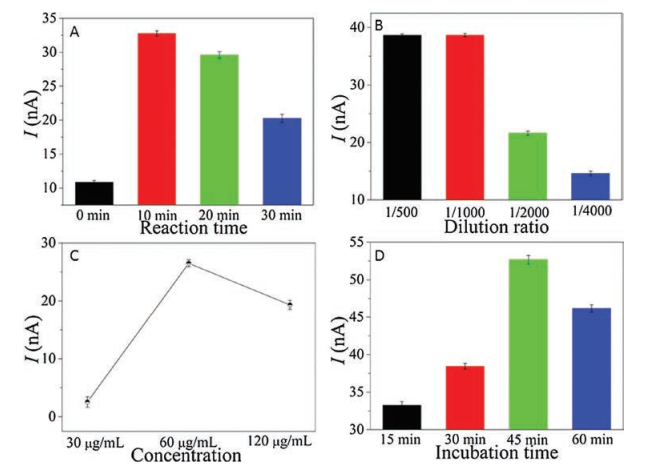 In addition, the concentration of pAPP and the reaction time for enzymatic reaction between pAPP and ALP were also optimized. DPV curves for 30 μg/mL, 60 μg/mL and 90 μg/mL pAPP were measured by the immunosensor with 5 μIU/mL TSH, 1/1000 ALP-Ab2, and a 45 min incubation time to form the sandwich immunocomplex. As illustrated in Fig. 2C, the oxidation currents increased with the increase of pAPP concentration from 30 μg/mL to 60 μg/mL, then decreased with the increase of pAPP concentration from 60 μg/mL to 120 μg/mL. The results indicated that the best concentration of pAPP was 60 μg/mL. Enzymatic reaction time was tested at 0, 10, 20 and 30 min when the immunosensor was incubated with 5 μIU/mL TSH, 1/1000 ALP-Ab2, a 45 min incubation time and was added into 40 μL pAPP (60 μg/mL). As shown in Fig. 2D, a highest current was observed when the the reaction time was 10 min.