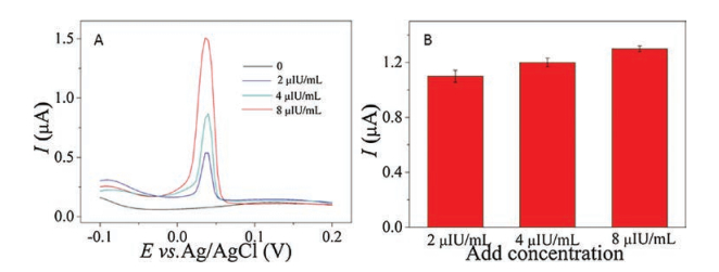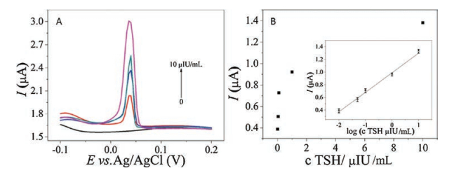 Figure 3 DPV responses (A) and calibration curves (B) for the electrochemical immunosensor corresponding to the analysis of different concentrations of target TSH. Inset (B): the linear relationship of currents versus the logarithm of target concentration in the range from 0.01 to 10 μIU/mL. Error bars showed the standard deviation of three experiments.