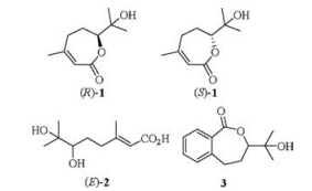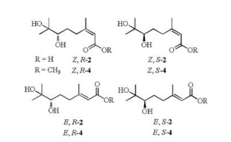 In the literatures, 6, 7-dihydroxy-3, 7-dimethyloct-2-enoic acid was isolated from the root of Litsea cubeba, and the configuration of its double bond was determined to E by the synthesis and comparison of its NMR data with the Z isomer [1, 4, 8]. However, the natural E isomer only had a [α]D20 - 0:8 (c 0.35, MeOH) optical rotation [4], we deduced that it was almost the racemic compound compared with the [α]D20 - 30:1 (c 1.2, MeOH) for the (E, S)-2, and [α]D20 + 26:3 (c 1.5, MeOH) for the (E, R)-2 synthesized in this paper.