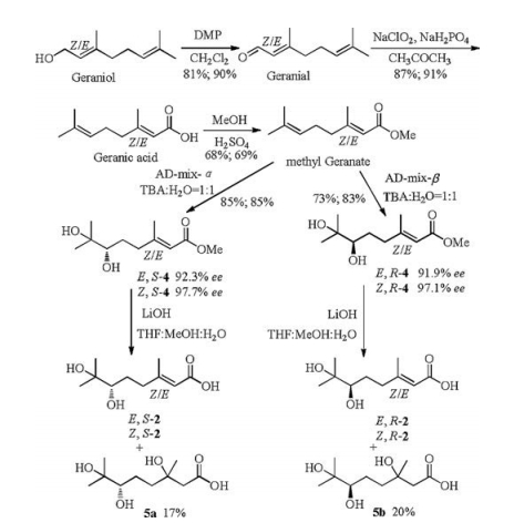 The synthetic strategy (Scheme 1) was initially investigated according to the procedures in the previous report [9]. First, cis-/trans-geraniols were oxidized to cis-/trans-geranials by DessMartin oxidant reagent (DMP). Then cis-/trans-geranials were further oxidized to cis-/trans-geranic acids with NaClO2 [6]. Because the acids could not react with the AD-mix-α/AD-mix-β directly, so the esters were prepared via the acids and methanol in the presence of concentrated H2SO4 at ambient temperature. Then the Sharpless asymmetry dihydroxylation of the esters were conducted with AD-mix-α and AD-mix-β to successfully give the chiral vicinal diol esters 4 (Figs. S1-8 and S65-70 in Supporting information) in 35.0%-48.0% overall yields with 91.9%-97.7% ee values, respectively. However, when they were hydrolyzed by base solution, only the mixtures of 2 and the Michael addition products 5 were afforded under various conditions such as LiOH, NaOH, KOH as the base, the water, water-methanol, water-THF, watermethanol-THF and isopropanol as the solvents. Unfortunately, even repeatedly performing the purification of the mixtures though preparative HPLC and TLC plates, we could not get a pure product 2 from the reaction mixture. Occasionally, the pure byproduct 5a and 5b were obtained in very low yield by preparative TLC plates and their structures were characterized by 1H NMR, 13C NMR (Figs. S9-12 in Supporting information) and high resolution mass spectrometry. Nonetheless, the absolute configuration of new chiral center was uncertain.