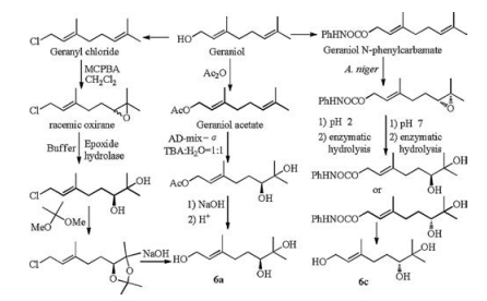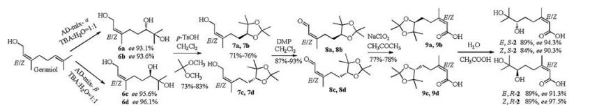 Because of the unsuccessful transformation from chiral esters to acids by hydrolysis, and construction chiral centers via Sharpless asymmetry dihydroxylation of cis- and trans-geranials due to their complexity of products in water media, then we have to change our synthetic strategy and go back to the raw materials (Schemes 2 and 3). To the best of our knowledge, trans-geraniol could be transferred to chiral triol mono acetate or N-phenylcarbamate, or geranyl chloride vic-diol by Sharpless asymmetry dihydroxylation, biological transformation or chemo-enzymatic hydrolysis with high ee values [16-21] (Scheme 2), whereas, these conversion approaches from these mono acetate or N-phenylcarbamate to chiral triol 6a and 6c need further exploration. On the other side, the resolution of chiral triol mono benzoate by formation and chromatographic separation of diastereoisomeric esters and further reduction with LiAlH4 to produce chiral triol 6a and 6c has also been reported [22]. All of these methods would take 3-5 steps and the overall yields were not satisfied. Although the selective direct dihydroxylation of geraniol double bond at allylic alcohol position by OsO4-TMEDA system at -78 ℃ was disclosed [23], the selective direct transformation at the remotedouble bond from geraniol to chiral triol 6a-6d was seldom found in references [24].