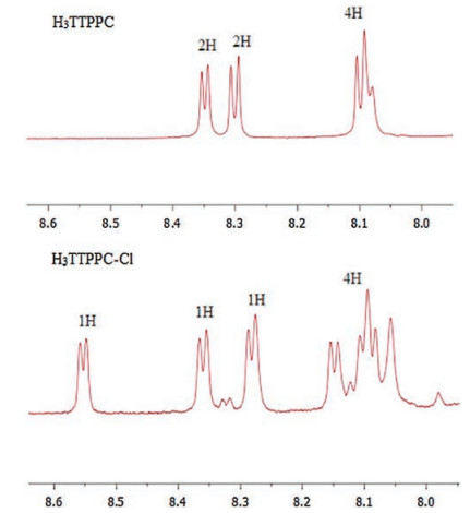 We performed the synthetic experiment by one-pot two steps procedure as described in Supporting information.Except for normal corrole 3(H3TTPPC, yield3.9%), a new green compound 4 with close Rf value to 3 was obtained with an isolated yield of 5.7%. UV–vis spectrum of 4 indicated that it was a porphyrinoid macrocycle. Surprisingly, ESI-HR mass spectrum of 4 showed mass ion peak at 1245.4658 (Fig. S2 in Supporting information) which was neither corresponding to A4-type porphyrin 1 (H2TTPPP) nor to corrole 3 (H3TTPPC), even not to A3B-type meso-cyano porphyrin 2 (H2TTPPPCN). The difference of 281 mass units between the observed mass and A4-type porphyrin 1 (H2TTPPP) vanished the possibility of formation of A4-type porphyrin 1 (H2TTPPP). Nonetheless, difference of 3 mass units eradicated the possibility of formation of A3B-type meso-cyano porphyrin 2 (H2TTPPPCN). Nevertheless, it even eliminated the chance of formation of A3-type porphyrin because the difference of 23 mass units between the observed mass.1HNMR spectra provide decisive information about the macrocycle; whether it is porphyrin or not may be easily determined by the presence of high field proton [35]. The 1H NMR spectrum of 4 revealed the absence of any high field proton eradicating the formation of a porphyrin derivative (Fig. S4 in Supporting information). The 1H NMR spectrum of unexpected macrocycle 4 showed the same number of phenyl proton with corrole 3(H3TTPPC)(Figs. S3 and S4 in Supporting information), but one less β-proton was observed in its 1H NMR spectrum (Fig. 2). From these observations, we hypothesized that the unexpected product was a mono-β-chlorinated derivative of its parent corrole 3 (H3TTPPC), and this was strongly supported by its HR-MS spectrum.