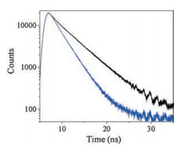 Chlorination has a significant effect on the excited states characteristics of corroles. Previously, our group has reported that the substitution of one chloride at one of the remote ring of triarlycorroles significantly decreases its fluorescence quantum yield due to increase in the intersystem crossing rate constant [15]. Significant decrease in fluorescence intensity for the β-pyrrole chlorinated corrole 4 (H3TTPPC-Cl) was also observed, and the fluorescence emission maxima was red shifted as compared to non-chlorinated corrole (Figs. S6a and b in Supporting information). Furthermore, the fluorescence decay were measured by exciting the samples at 440 nm (Fig. 4). The obtained decay profile for corroles complied with single exponential fitting, indicating one luminescent component in both cases. The calculated fluorescence lifetimes are 4.2 ns and 2.5 ns for 3 (H3TTPPC) and 4 (H3TTPPC-Cl), respectively. Fluorescence quantum yields were measured with excitation at 550 nm, using tetra-phenylporphyrin (H2TPP) as reference (Φf = 0.11) [52], the data demonstrated lower fluorescence quantum yield of chlorinated corrole as compared to non-chlorinated corrole (Table S3 in Supporting information).