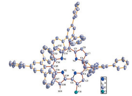 We have succeeded to get suitable single crystal of 4 (H3TTPPC-Cl) by slow evaporation from a solvent system of dichloromethane/methanol for crystallographic characterization. Its CCDC number is 1584077. The crystal structure revealed that one β-proton on position 2 was substituted by chloride in the unexpected 2-chloro-5,10,15-tris(2,4,6-triphenylphenyl)-corrole 4 (Scheme 2), and the crystal had a formulation unit in the cell with a triclinic P-1 space group. Single crystal X-ray structure also revealed that macrocycle 4 had a distorted planar structure. The bond length between C2-Cl1(2) is 1.700Å. The bond angle between C11-N3-C14, C16-N2-C19, C1-N1-C4 and C6-N4-C9 is 109.49(16)°, 109.73(17)°, 111.70(16)° and 109.38(17)° respectively with average value of 110.07°. The average distance between 23 core atoms of corrole is 1.395Å (Table S1 in Supporting information). Interestingly, crystal-packing of 4 (H3TTPPC-Cl) showed a one dimensional chain structure, making hydrogen bonding with hydrogen atom of triphenylbenzene and the chlorine present on position 2 of corrole skeleton (C—H…Cl). Corrole molecules have interplanar distance of 9.26Å approximately, in which neighboring corrole molecules take 180° off-set arrangement in regular manner (Scheme S1 in Supporting information).