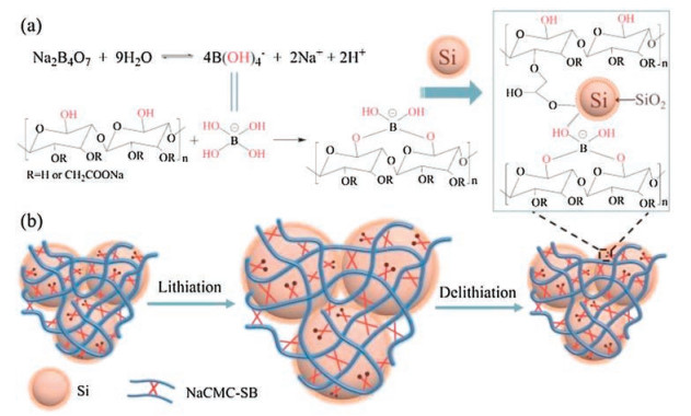 Figure 1. (a) The chemical structure and illustrative interaction between sodium carboxymethyl cellulose, sodium borate and silicon nanoparticles; (b) Graphical representation of Si/NaCMC-SB configurations during lithiation/delithiation process.The NaCMC-SB binder was synthesized through crosslinking sodium carboxymethyl cellulose by sodium borate. Typically, a mixture of aqueous NaCMC and sodium borate was heated at 85 ℃ to enable the hydrolysis of the sodium borate. It has been well demonstrated that sodium borate would readily hydrolyze into B(OH)4- as shown in Fig. 1a [31, 32]. This pretreated mixture was further directly used as binder for making silicon electrodes, followed by drying at 100 ℃ to allow the crosslinking via the condensation reaction between NaCMC and SB. The chemical structure and crosslinking reaction were schematically shown in Fig. 1a. It should be noted that the whole synthesis and electrode fabrication process were accomplished using water as solvent, avoiding the use of large amount of toxic and odor organic solvent, such as N, N-dimethylformamide (DMF) and dimethylacetamide (DMAC) in the Poly (vinylidene fluoride) (PVDF) binder. This ecofriendly, low-cost binder makes it more attractive for practical application.