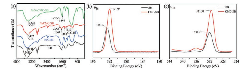 The interaction between NaCMC, SB and silicon was investigated by FTIR and XPS. As shown in Fig. 2a, a strong broad peak centered at 3435 cm-1 was observed in the spectrum of NaCMC, which is attributed to the stretching vibration of the -OH group. This peak was found to downshift to a lower wavenumber of 3417 cm-1 for NaCMC-SB hybrid gel, which was mainly due to hydrogen bonds between -OH groups of NaCMC and borate ion of SB [33]. The NaCMC-SB sample displays new peaks at 1458 cm-1 and 1377 cm-1, which was assigned to the asymmetric peaks of B—O—C [32], indicating the crosslinking of NaCMC and SB. When applied as binder for silicon anode, the characteristic peak of —COO- at 1643 cm-1 for NaCMC-SB decreased to 1597 cm-1, suggesting that the —COO- groups of NaCMC could chemically bond with SiO2 thin layer of silicon nanoparticles [34]. Moreover, characteristic peak of —OH at 3417 cm-1 for NaCMC-SB shifted to 3398 cm-1 in the presence of Si, indicating that the occurrence of condensation reaction between —OH of sodium borate and Si—OH of Si. The chemical interaction between these components of the silicon electrode was schematically shown in Fig. 1a.