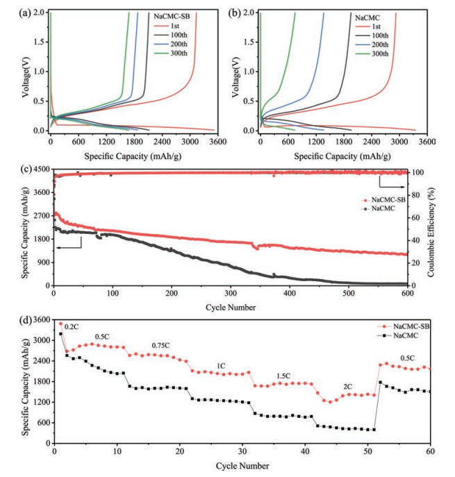 The rate capability of the silicon anode with NaCMC-SB hybrid binder and NaCMC were further evaluated with C-rate ranging from 0.2 C to 2 C. The sample with NaCMC-SB binder always displays higher capacity than that with NaCMC binder within the test range. In detail, the high capacity of ~3486.2 mAh/g, ~2890.5 mAh/g was achieved with NaCMC-SB binder at relatively low C-rate of 0.2 C and 0.5 C, respectively. The good rate capacity was demonstrated by the high capacity of 1468.9 mAh/g with increasing the current to 2 C. By contrast, NaCMC binder only left 490 mAh/g at 2 C. When the rate decreased back to 0.5 C, the NaCMC-SB/Si electrode delivered a discharge capacity of 2326.0 mAh/g practically returning to the capacity at preceding rate of 0.5 C, suggesting a good reversibility upon current change.