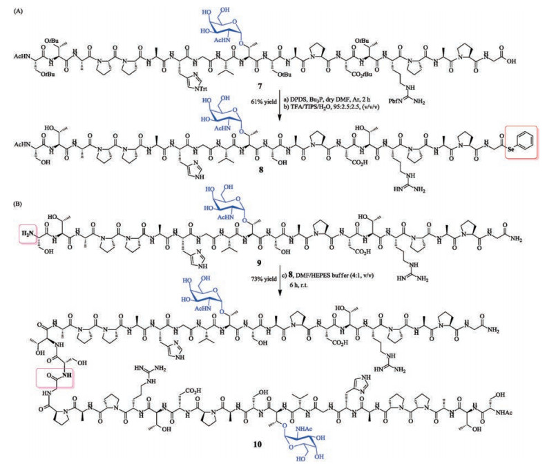 • Direct aminolysis of selenoester in aqueous media was investigated as a glycopeptide ligation strategy. This strategy allows the peptide and glycopeptide ligation to proceed smoothly (even with hindered amino acids) without the need of cysteine residue, N-terminal thiol auxiliary or coupling additive, and to afford the corresponding amide products in excellent yields. No epimerization was observed during ligation reations. In this work, the selenoester of unprotected glycopeptide was readily prepared, and the direct aminolysis of glycopeptide selenoester was successfully applied to synthesize MUC1 mucin sequence efficiently.