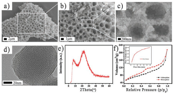 Figure 1. (a, b, c) Scanning electronic microscopy (SEM) images of hsMSNA under different magnifications; (d) HRTEM image of MSNs comprising hsMSNA; XRD pattern (e) and N2 adsorption (black) and desorption (red) patterns (f) of hsMSNA. (For interpretation of the references to colour in this figure legend, the reader is referred to the web version of this article)In order to successfully synthesize hsMSNA with uniform and controllable particle sizes and pores, various conditions were established by changing the chemical volumes to obtain different hsMSNA. The results show that the EDA acted as a good sizecontrol agent by influencing the acidity of the reaction situation. Therefore, we performed a systematic investigation of the effects of varying EDA fractions on the sieve-like structures of the hsMSNA. The sizes, morphologies, and structures of hsMSNA synthesized using different EDA fractions were investigated using SEM and TEM (Fig. 2). When the EDA volume was increased from 0.5 mL to 4 mL, different sieve-like structures and pore sizes were obtained. In particular, differences in the hierarchical structures were observed in specific directions. In the vertical direction, sieve- (Figs. 2a1–a3), mesh- (Figs. 2b1–b3), and vesicular-like (Figs. 2c1–c3) 3D structures corresponding to 0.5, 2, and 4 mL EDA, were obtained, respectively. We assume that, with increasing EDA content, the interface viscosity is increased. Moreover, the higher alkaline environment induced by the EDA accelerates the TEOS hydrolysis rate, during which the deposition speed is considerably larger than the growth rate, finally yielding a vesicular-like structure. N2 adsorption-desorption isotherms of different hsMSNA exhibited the same typical Ⅳ isotherm but different desorption path and volume value due to the network-percolation effects and a variation of pore diameter along single channels [28, 29]. It was clearly that mesh-like structure resulted a highest adsorption amount because of the more complicated pore distribution.