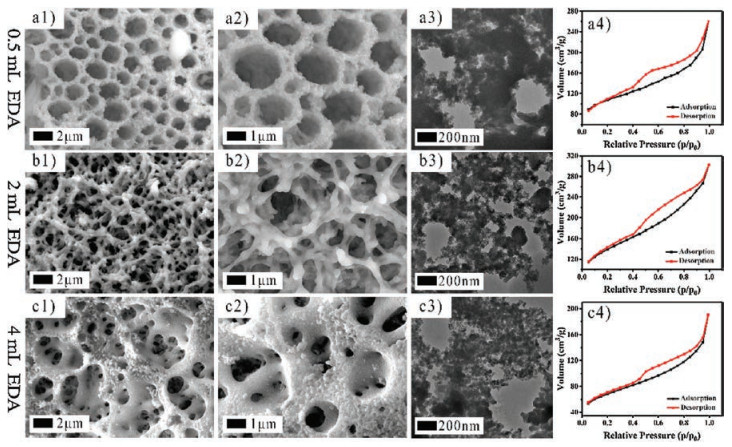 During preparation, the colloidal growth standing time and the centrifugation speed are other main factors influencing the formation of the sieve-like structures of the hsMSNA. For 0.5 mL EDA and an 18 h standing time, the centrifugation time was decreased from 10 to 5 min; hence, it was found that the hsMSNA exhibit a higher surface area (477.10 m2/g) and larger pore volume (0.47 m3/g) (Table 1) for a lower centrifugation rate, which produces a lower force. Further, the average hsMNA pore diameter increases from 3.98 nm to 4.14 nm as the centrifugation time is extended, because there is more time for the colloidal silica assembly process. The high pore volumes of the hsMSNA indicate that they could be endothermic and, thus, constitute a promising material for use in drug delivery systems, catalysis, and sewage purification [30-32].