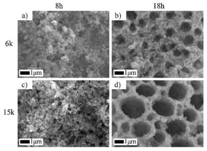 Furthermore, the influence of the colloidal growth standing time under different centrifugation rates was considered (Fig. 3). When the colloidal growth standing time was 8 h, no hsMSNA could be formed, even under a high centrifugation rate of 15, 000 rpm. In that case, the sieve-like structures did not form as the oil-water interface formation was incomplete (Figs. 3a and c). Therefore, no transition process occurred. However, after the standing time was increased to 18 h, a sieve-like structure was observed. Further, the sieve-like structure was affected by the centrifugation speed (Figs. 3b and d). That is, with increasing centrifugation speed, the morphology and microstructure of the sieve-like structure was better, resulting in the increased pore diameters and better uniformity of pores. This enhancement occurred because a larger curvature of distortion is obtained under a larger centrifugation-induced force.