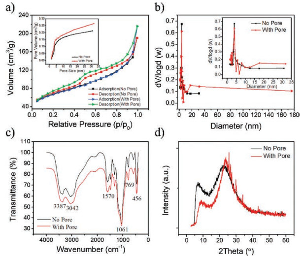 Figure 4 (a) N2 adsorption (black and blue) and desorption (red and green) patterns of silica nanoparticle aggregates without (black and red) and with (blue and green) large pores; Inset: Pore size distribution of silica nanoparticle aggregates with (red) or without (black) pores. (b) Particle diameter distribution curves of silica nanoparticle aggregates with (red) or without (black) pores. Inset: Diameter distribution in 0–35 nm range. (c) FT-IR spectra of MSN aggregates with (red) or without (black) pores. (d) XRD patterns of as-synthesized MSN aggregates with (red) or without (black) pores. (For interpretation of the references to colour in this figure legend, the reader is referred to the web version of this article)